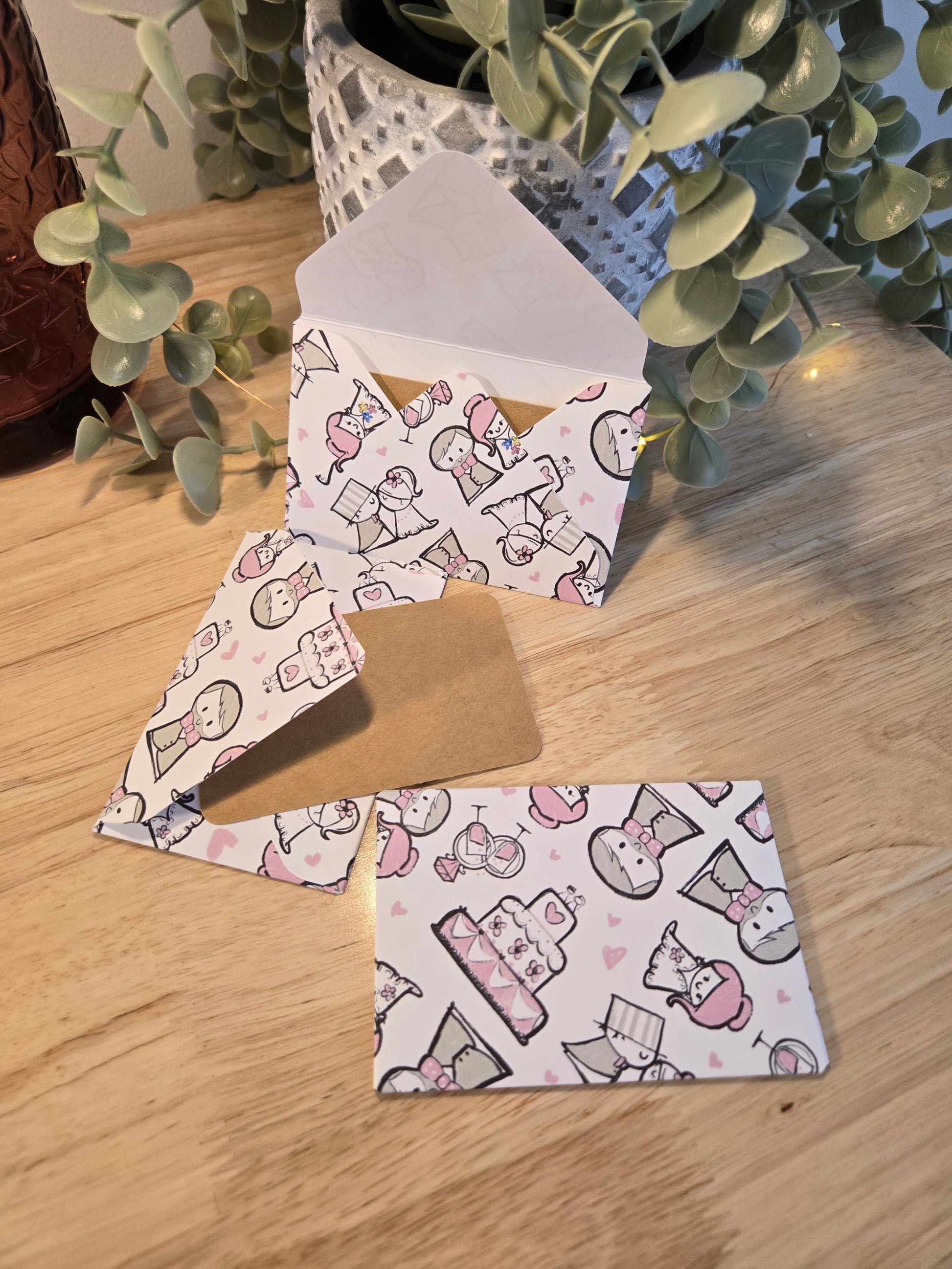De la collection VIVE LES MARIÉS, cet ensemble de 3 petites enveloppes de cartes cadeaux est imprimé sur un carton mat et blanc. Elles viennent avec une carte de couleur brun kraft.