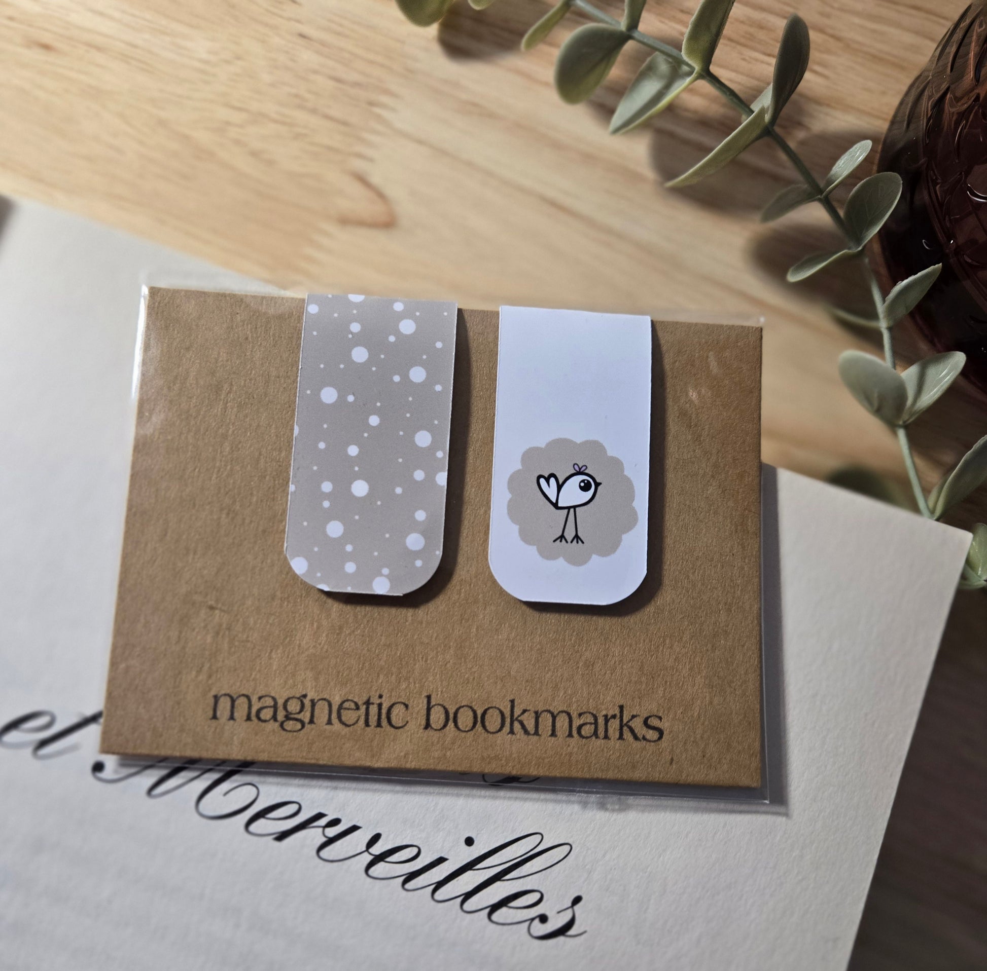 De la collection JOLI MOINEAU, ce set de deux petits signets magnétiques est imprimé sur un carton mat et blanc et laminé d'un côté. Il y a un aimant délicat au centre.