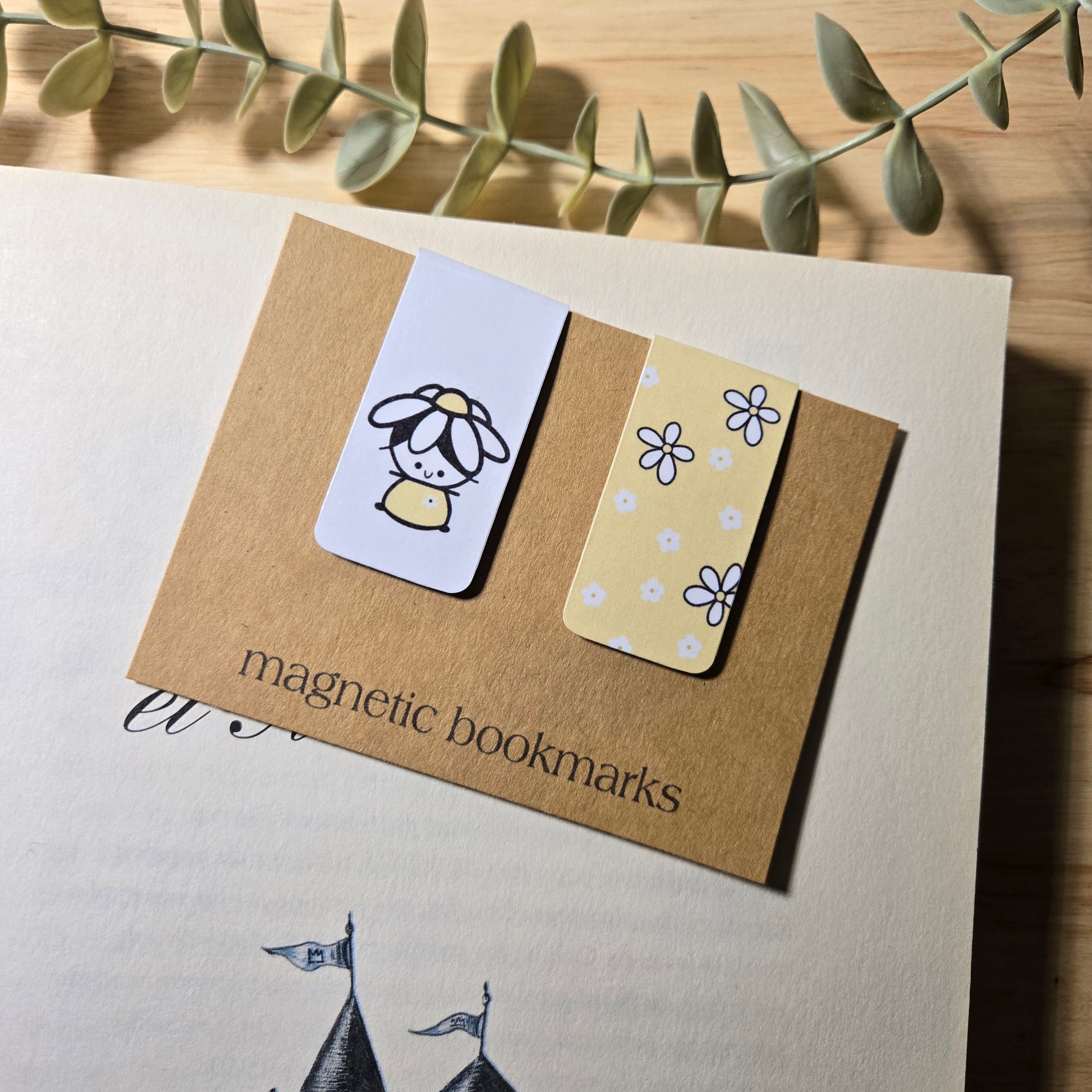 De la collection MARGUERITE, ce set de deux petits signets magnétiques est imprimé sur un carton mat et blanc et laminé d'un côté. Il y a un aimant délicat au centre.