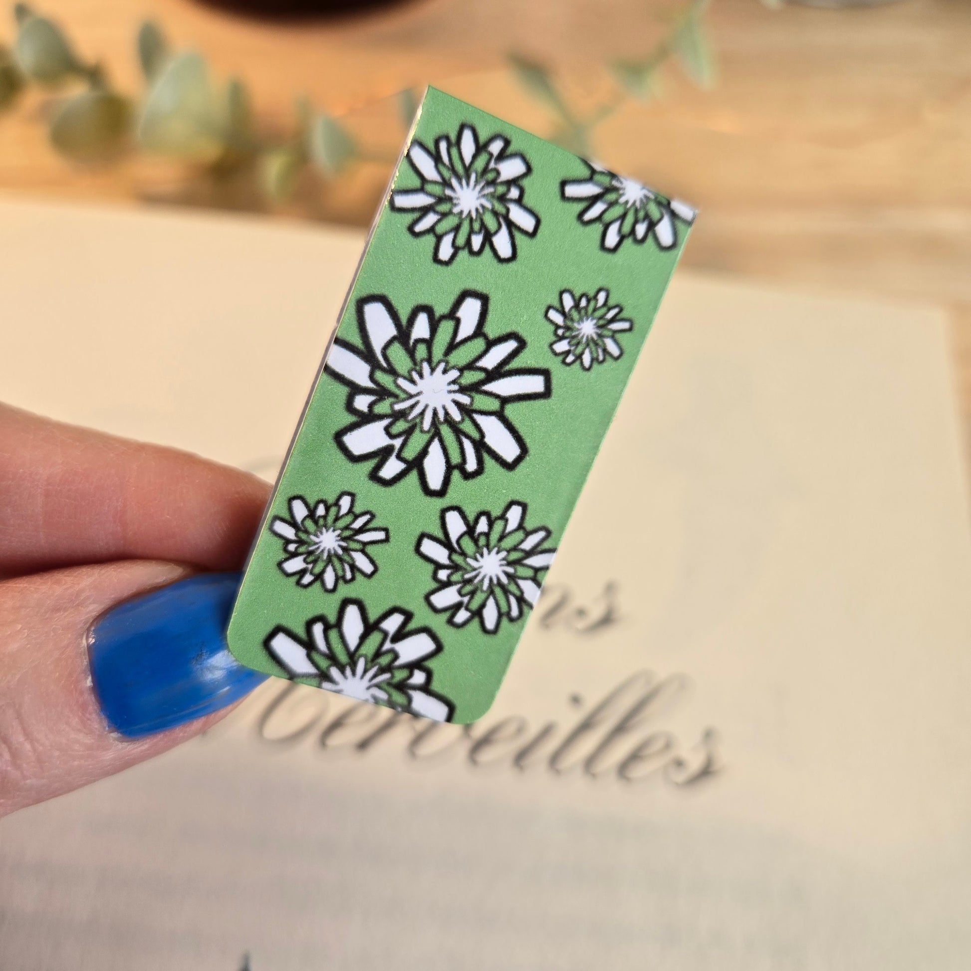 De la collection POMPOM, ce set de deux petits signets magnétiques est imprimé sur un carton mat et blanc et est laminé d'un côté. Il y a un aimant délicat au centre.