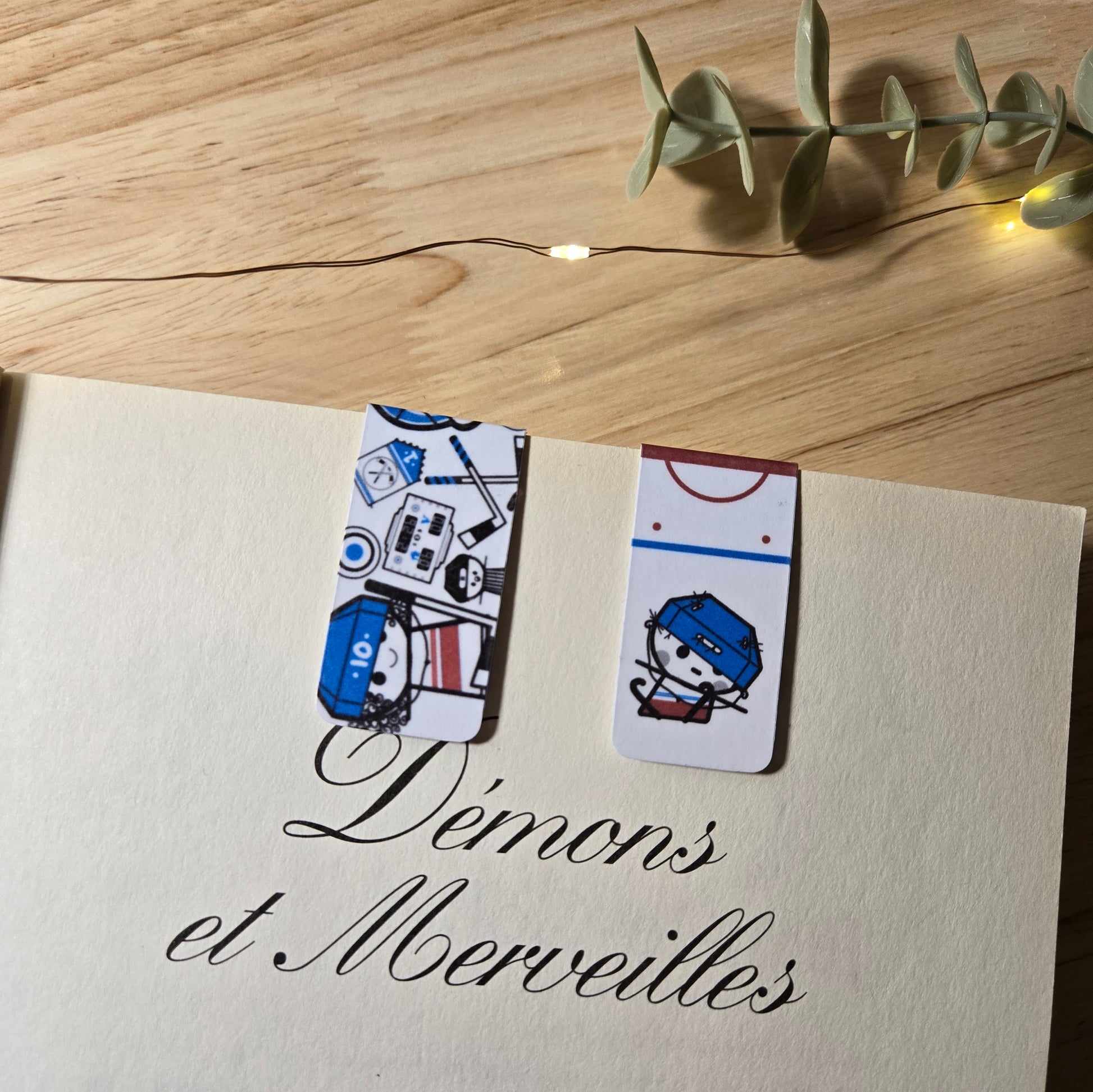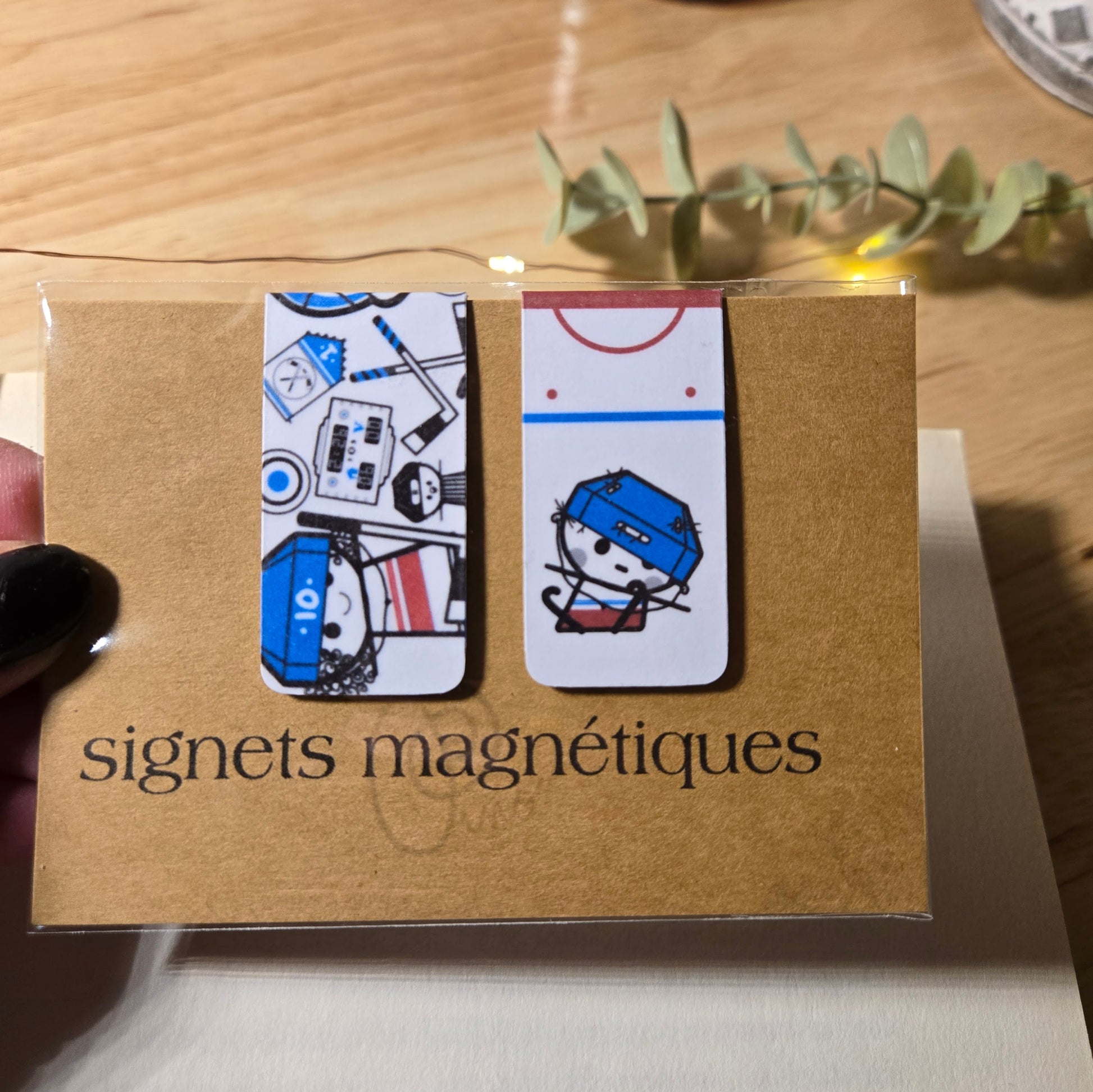 De la collection LA SOIRÉE DU HOCKEY, ce set de deux petits signets magnétiques est imprimé sur un carton mat et blanc et est laminé d'un côté. Il y a un aimant délicat au centre.