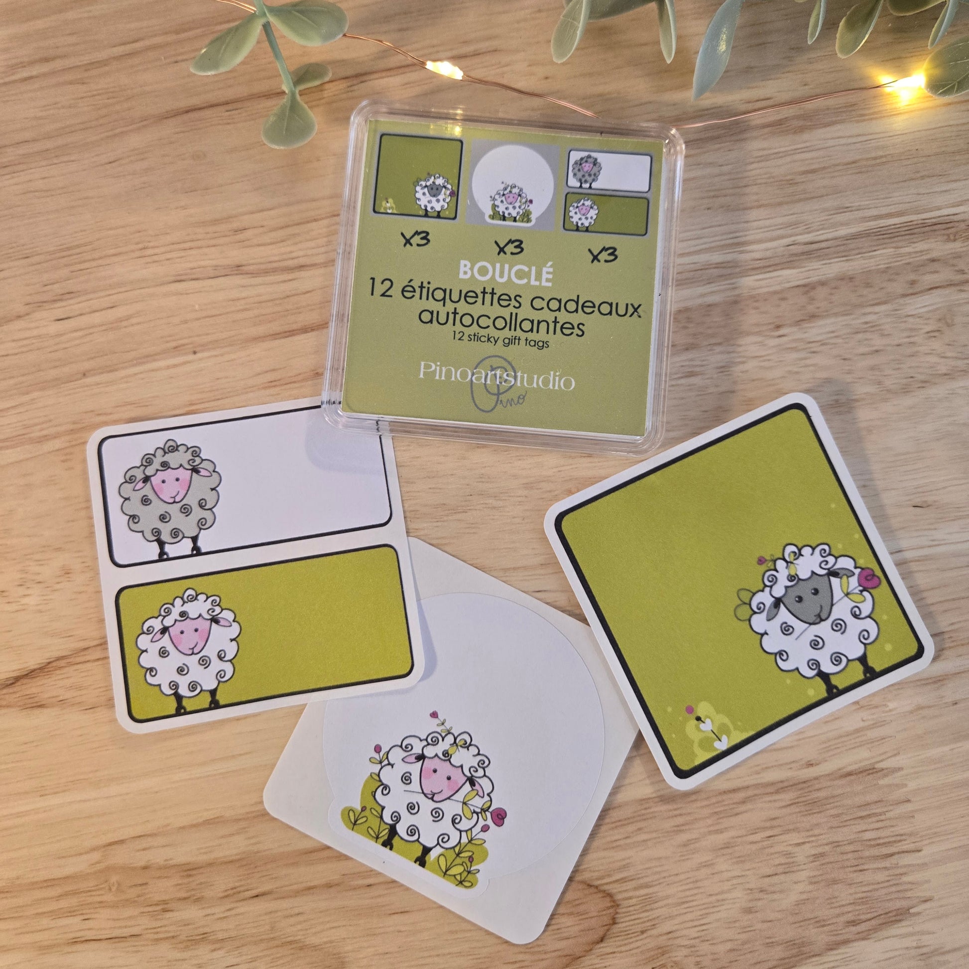 De la collection BOUCLÉ, cet ensemble de 12 étiquettes autocollantes est imprimé sur un papier de vinyl mat. Ils sont présentés dans un petit boîtier d'acrylique de 65mm x 65mm.