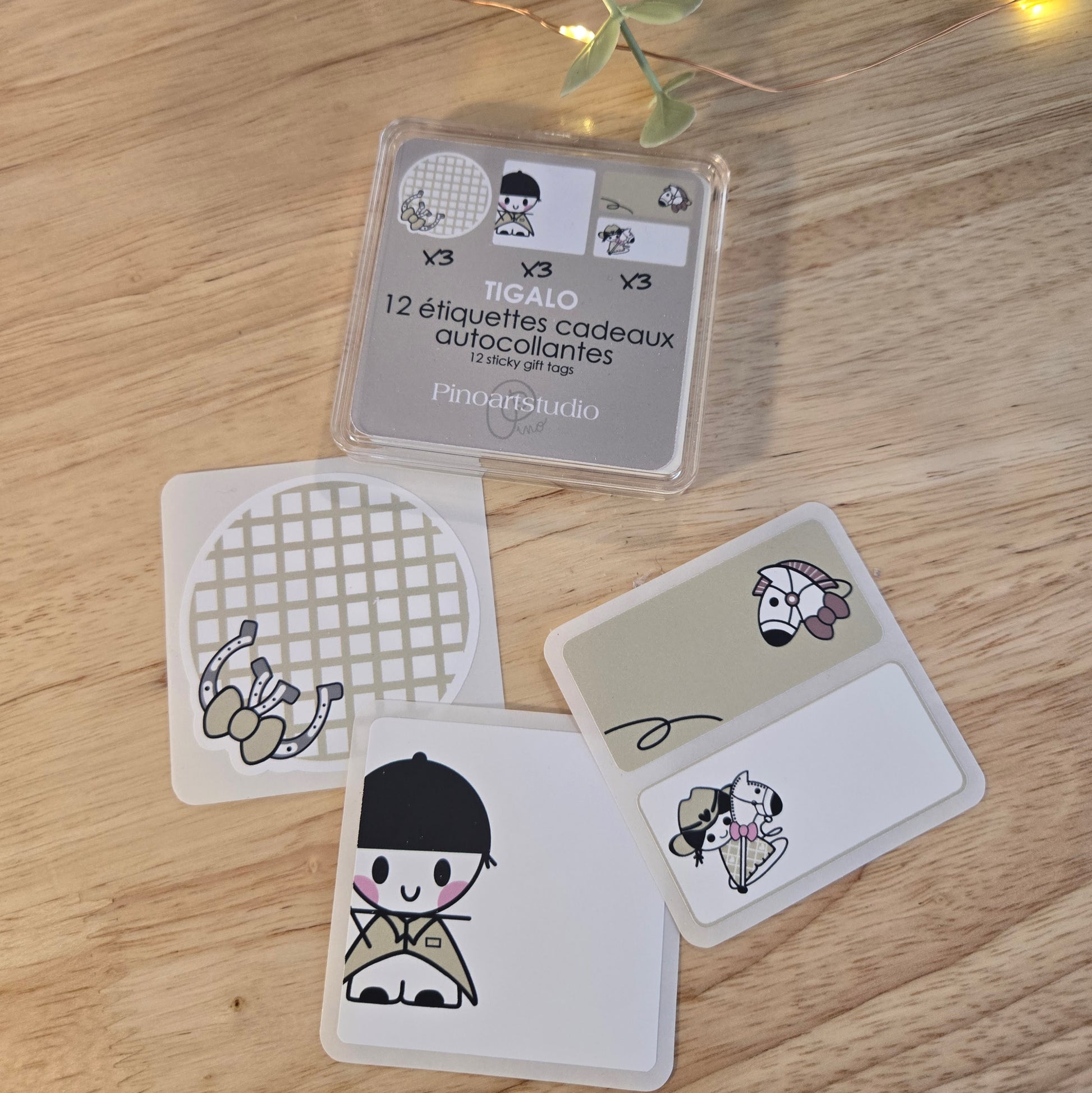 De la collection TIGALO, cet ensemble de 12 étiquettes autocollantes est imprimé sur un papier de vinyl mat. Ils sont présentés dans un petit boîtier d'acrylique de 65mm x 65mm.