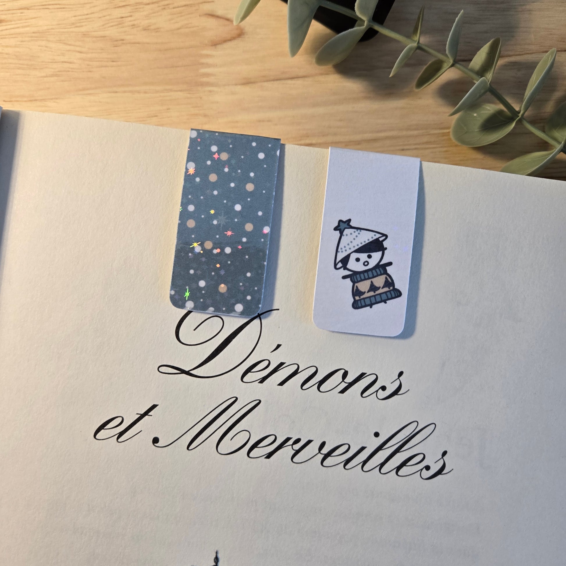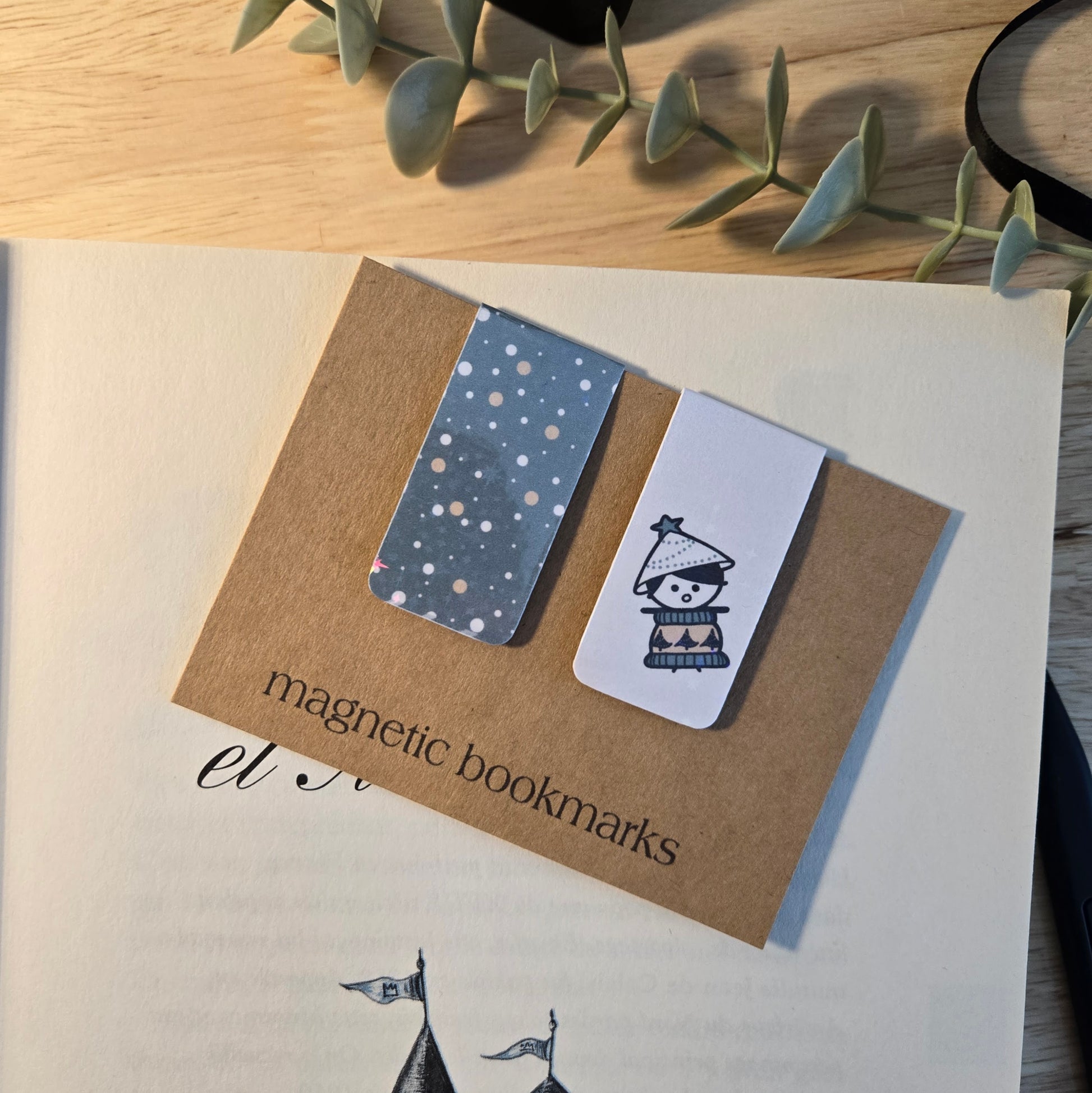 De la collection CHANDAILS MOCHES, cet ensemble de deux petits signets magnétiques est imprimé sur un carton mat et blanc et laminé d'un côté. Il y a un aimant délicat au centre.