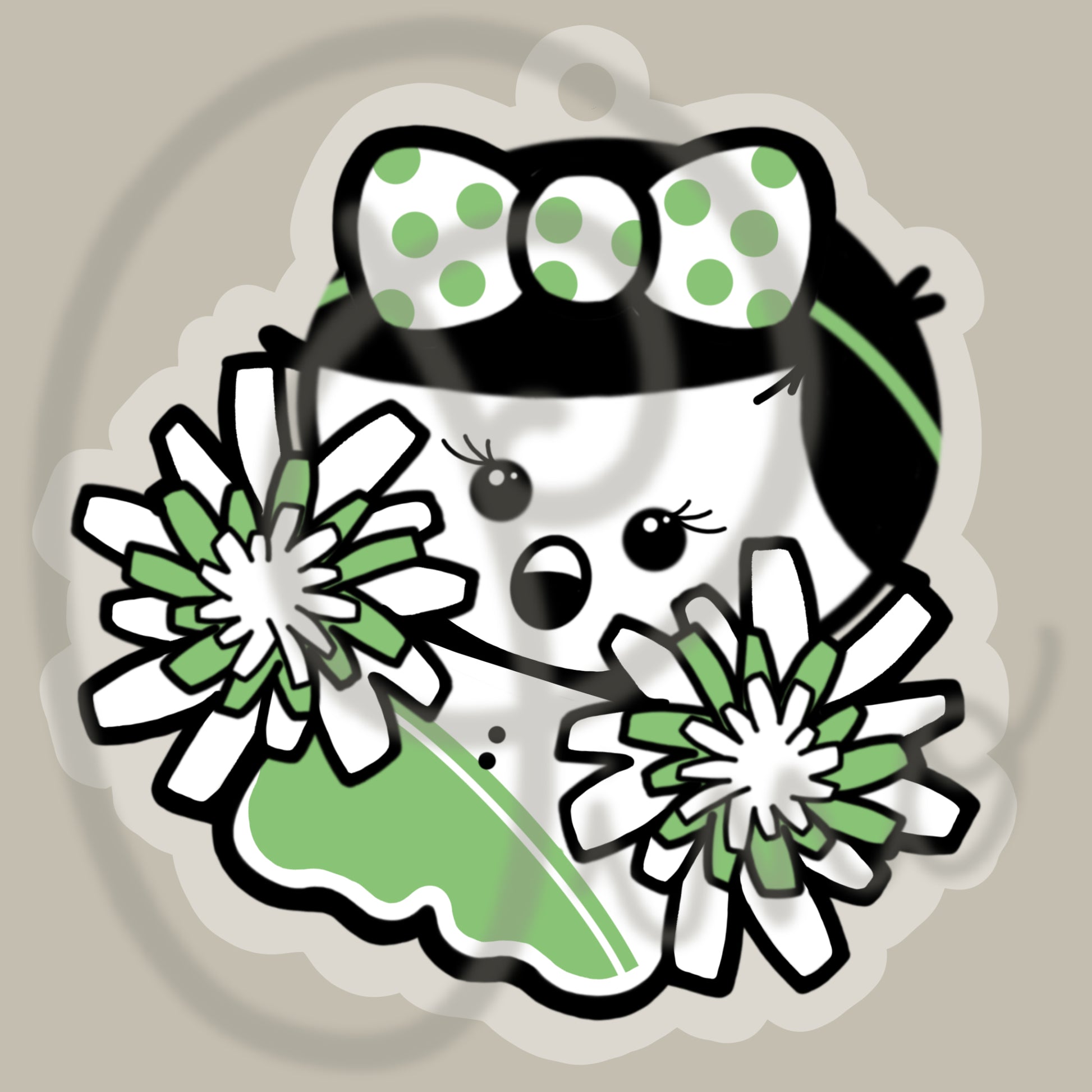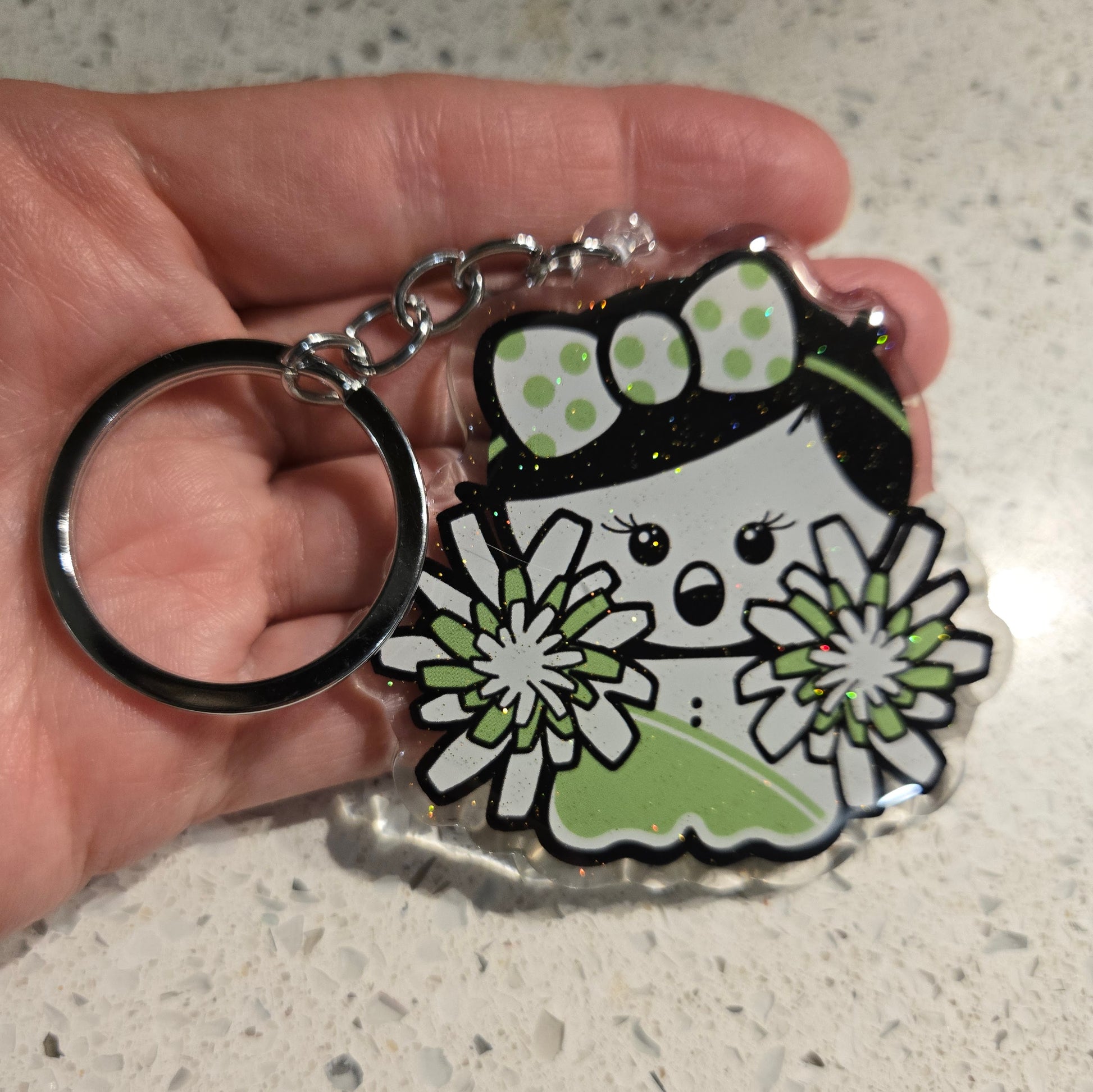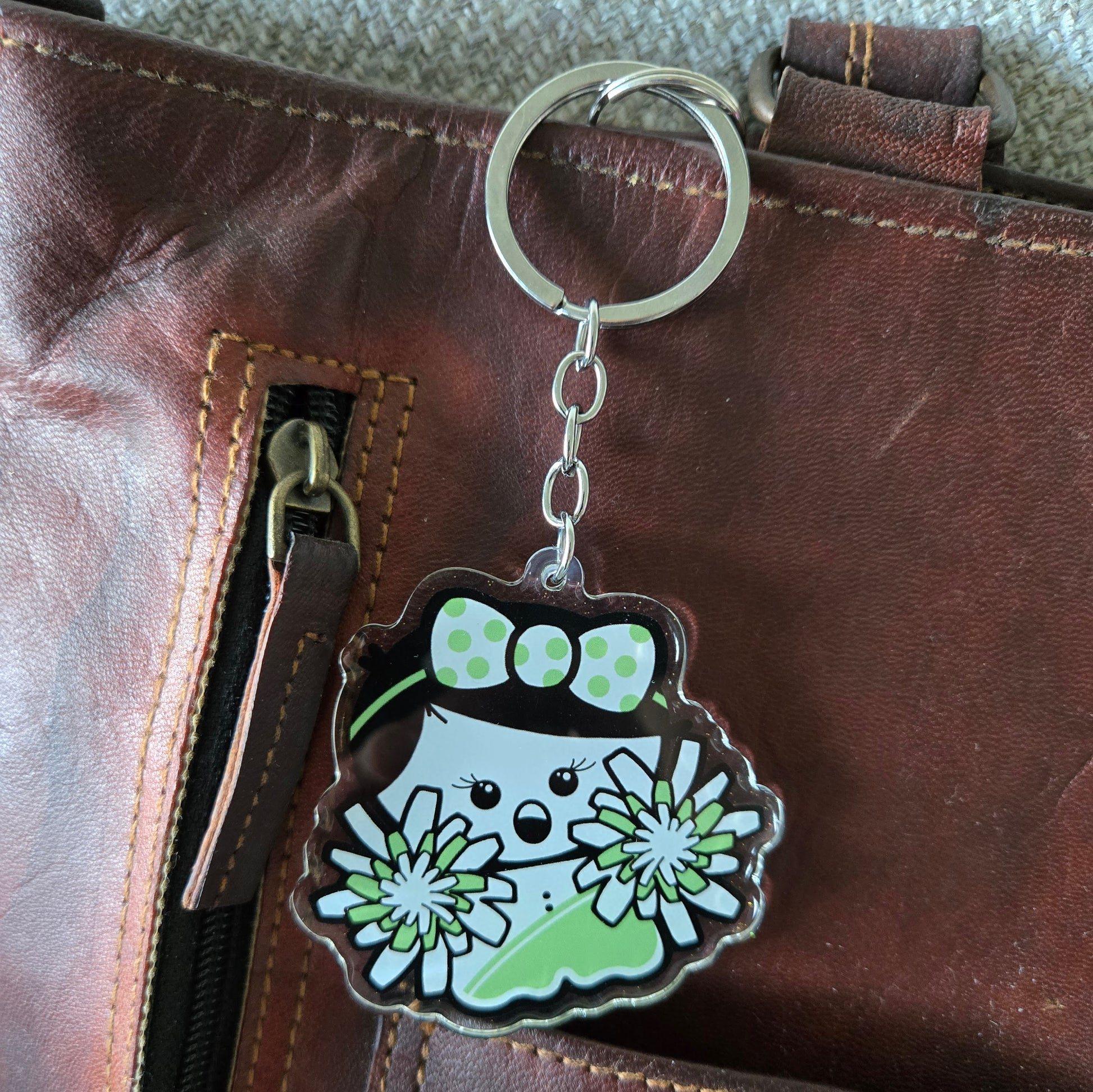 De la collection POMPOM, ce porte-clés en acrylique avec image recto-verso finie epoxy pailletté d'un seul côté, mesure 60 mm x 60 mm avec un anneau de 32 mm. Extrêmement léger.