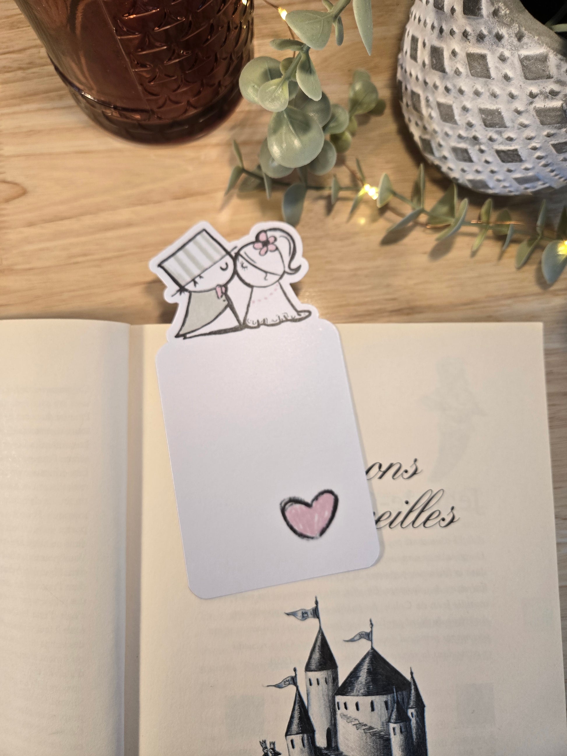 De la collection VIVE LES MARIÉS, ce signet est imprimé sur un carton blanc mat et est laminé d'un côté.