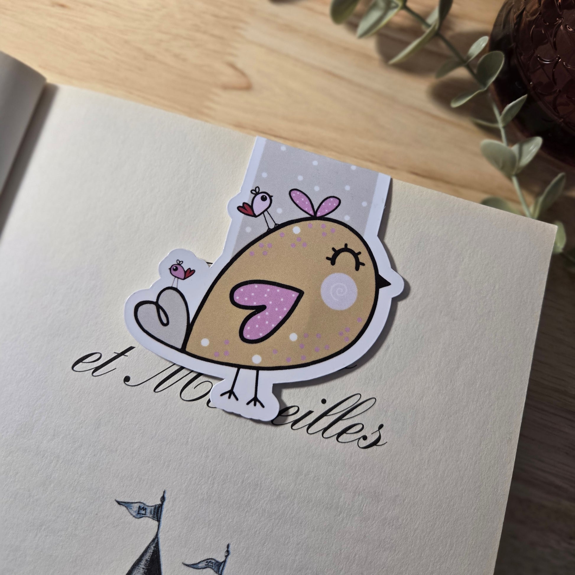 De la collection JOLI MOINEAU, ce signet magnétique est imprimé sur un carton mat et blanc et est laminé d'un côté. Il y a un aimant délicat au centre.